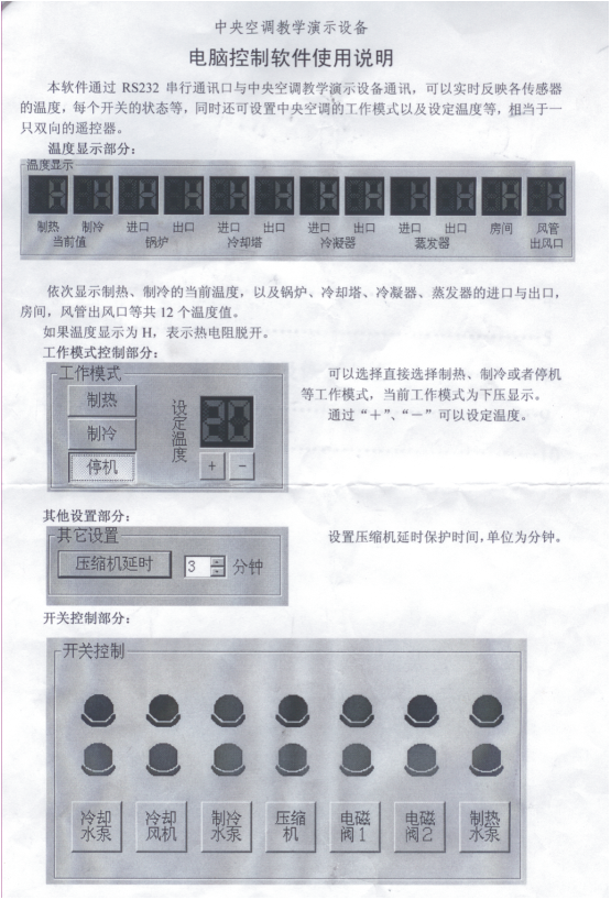 為了更好地滿足各大院校的教學(xué)需要,在原來開發(fā)的中央空調(diào)實(shí)驗(yàn)設(shè)備的基礎(chǔ)上,配備了RS-232串行通訊接口,可直接與電腦連接,由電腦控制軟件控制整個(gè)實(shí)驗(yàn)臺的運(yùn)行,包括:總控臺啟動(dòng)、制冷、制熱、冷卻水泵、冷卻風(fēng)機(jī)、制冷水泵、壓縮機(jī)、電磁閥、制熱水泵做演示,制冷、制熱的溫度設(shè)定等。