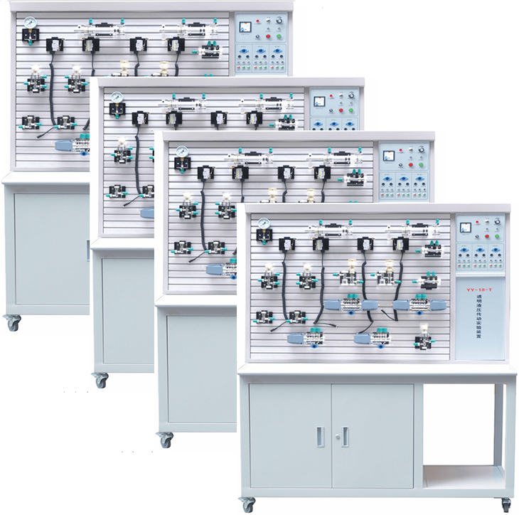 透明液壓實驗臺為實現(xiàn)液壓傳動課程現(xiàn)代化教學(xué)而進(jìn)行研究的最新科技成果,它填補了技校、中專、大專院校的液壓傳動透明教學(xué)設(shè)備的國家空白。液壓傳動具有重量輕、功率大、結(jié)構(gòu)簡單、布局靈活、控制方便等特點、速度、扭矩、功率均可作無級調(diào)節(jié),能迅速換向和變速,調(diào)速范圍寬,快速性好,工作平穩(wěn)、噪音小,元器件已實現(xiàn)系列化、標(biāo)準(zhǔn)化,通用化等一系列優(yōu)點,隨著科學(xué)技術(shù)的發(fā)展,液壓傳動作為一種可以傳遞動力和控制的傳動方式,已經(jīng)日益廣泛應(yīng)用到醫(yī)療、科技、軍事、工業(yè)自動化生產(chǎn)、起動、運輸、礦山、建筑、航空等各個領(lǐng)域。為了適應(yīng)在短暫課堂時間內(nèi),完成多個液壓油路的教學(xué)內(nèi)容。同時對比演示多個不同油路的工作原理。而且,使油路系統(tǒng)的安裝調(diào)試有必要的程序且不占用上課教學(xué)時間。就必須有多臺設(shè)備同時工作。同時,YY-18