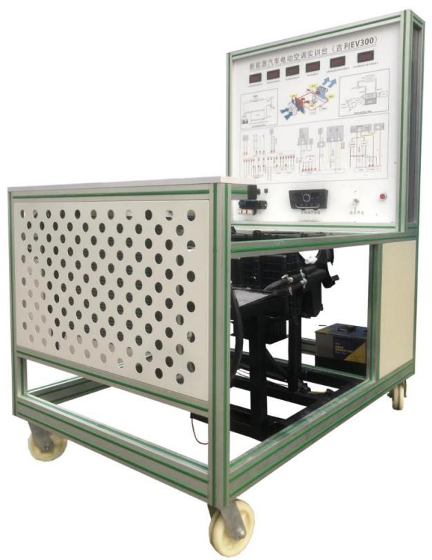 點(diǎn)火開(kāi)關(guān)、電動(dòng)汽車空調(diào)壓縮機(jī)、膨脹閥總成、干燥器總成、鼓風(fēng)機(jī)總成、冷凝器、冷卻電子風(fēng)扇、電動(dòng)空調(diào)壓縮機(jī)控制器總成、空調(diào)蒸發(fā)箱總成、充電器與充電接口、充電插線、DC-DC轉(zhuǎn)換器、鋰電池組、空調(diào)操作面板、高低壓空調(diào)壓力表、采暖模塊總成、電源總開(kāi)關(guān)、急停開(kāi)關(guān)、直流接觸器、輔助蓄電池(12V45AH)、一體化全鋁合金型材搭建的移動(dòng)臺(tái)架(1500×1000×1700mm ,帶自鎖腳輪裝置,帶安裝檢測(cè)端子的原理面板948×898mm)、故障模擬與排除裝置、設(shè)備操作說(shuō)明書。