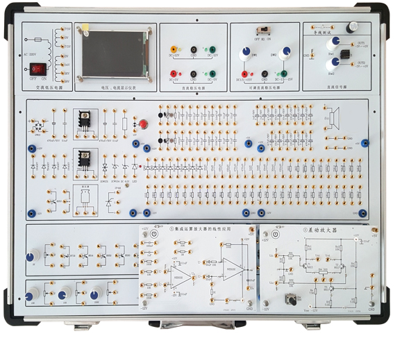 創(chuàng)新型模塊化模擬電路實(shí)驗(yàn)箱由全鋁合金箱體、高性能線(xiàn)性電源和實(shí)驗(yàn)電路板組成。其中實(shí)驗(yàn)電路既可以采用固定功能模塊方式,也可以自行搭建實(shí)驗(yàn)電路,電路原理和元器件符號(hào)清晰,實(shí)驗(yàn)用元器件全部焊裝在線(xiàn)路板的反面,安全可靠,不易損壞。本實(shí)驗(yàn)箱適用于本專(zhuān)院校所有電類(lèi)和非電類(lèi)專(zhuān)業(yè)《模擬電子技術(shù)》、《電子線(xiàn)路》等課程的實(shí)驗(yàn)教學(xué)。