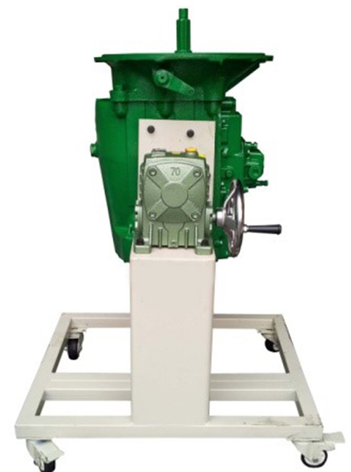 1.采用翻新天錦EQ1120GA2 8JS125TA型手動變速器總成(附件齊全,易于拆裝),并裝在專用翻轉(zhuǎn)架上。 采用減速翻轉(zhuǎn)機(jī)構(gòu),可使變速器旋轉(zhuǎn)任意角度,并能任意位置鎖止,便于學(xué)生從不同的角度進(jìn)行拆卸和裝配。