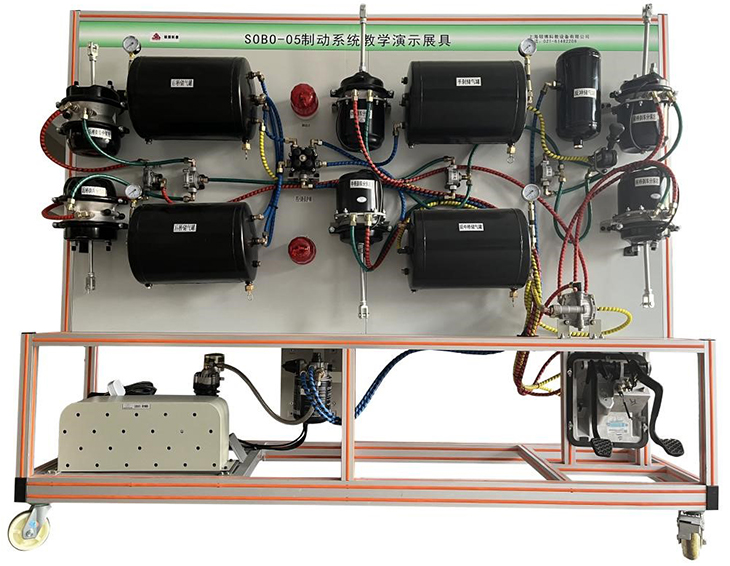 1.臺架上具有的全新東風天錦原車零部件有空氣壓縮機總成、空氣干燥劑、前橋儲氣筒、后橋儲氣筒、手制動儲氣筒、再生儲氣筒、輔助儲氣筒、四回路保護閥、制動腳閥、駐車閥、繼動閥、制動管路、氣壓表若干個。