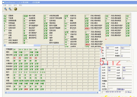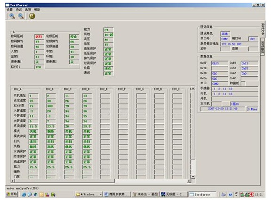 中央空調(diào)機由于工程復雜,設備分散,有的已經(jīng)裝修在開花板上測試程序,一但出現(xiàn)了故障,工程量相當大,為了能夠快速準確地測出故障是由主機機組還是室內(nèi)機的故障的,每個生產(chǎn)廠家根據(jù)生產(chǎn)的和維修的需要而開發(fā)了中央空調(diào)測試程序?蓽y試壓縮機的運轉(zhuǎn)頻率,傳感器的各種數(shù)據(jù),電子膨脹閥的工作步數(shù)等幾十種中央空調(diào)的工作數(shù)據(jù)和狀態(tài),軟件可實現(xiàn)對內(nèi)機的控制,,可以對1-64臺內(nèi)機的狀態(tài)進行設定。是高校提供了好的研究的學習設備。