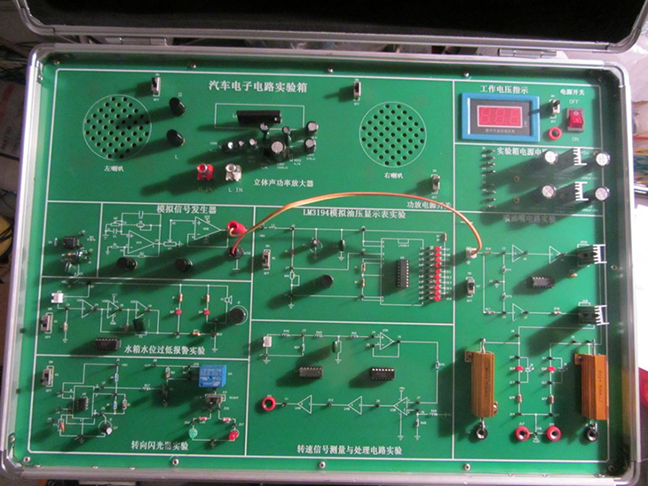 汽車電子電路實(shí)驗(yàn)箱結(jié)合汽車電學(xué)的典型基本電路,由淺到深地設(shè)計(jì)了二極管和三極管基本實(shí)驗(yàn)、線性集成穩(wěn)壓電源實(shí)驗(yàn)、噴油器驅(qū)動(dòng)實(shí)驗(yàn)、轉(zhuǎn)速信號(hào)測(cè)量與處理實(shí)驗(yàn)、水箱水位過低報(bào)警實(shí)驗(yàn)、轉(zhuǎn)向閃光器實(shí)驗(yàn)等六個(gè)實(shí)驗(yàn)項(xiàng)目,提供了一個(gè)給學(xué)生提高動(dòng)手能力,深入理解汽車電學(xué)基礎(chǔ)知識(shí)的實(shí)驗(yàn)平臺(tái)。