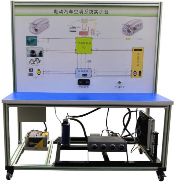點(diǎn)火開(kāi)關(guān)、電動(dòng)汽車(chē)空調(diào)壓縮機(jī)、膨脹閥總成、干燥器總成、鼓風(fēng)機(jī)總成、冷凝器、冷卻電子風(fēng)扇、電動(dòng)空調(diào)壓縮機(jī)控制器總成、空調(diào)蒸發(fā)箱總成、充電器與充電接口、充電插線(xiàn)、DC-DC轉(zhuǎn)換器、鋰電池組、空調(diào)操作面板、高低壓空調(diào)壓力表、采暖模塊總成、電源總開(kāi)關(guān)、急停開(kāi)關(guān)、直流接觸器、輔助蓄電池(12V45AH)、一體化全鋁合金型材搭建的移動(dòng)臺(tái)架(1500×700×1700mm 帶自鎖腳輪裝置,帶安裝檢測(cè)端子的原理面板,面板1448×940mm)、故障模擬與排除裝置、設(shè)備操作說(shuō)明書(shū)。